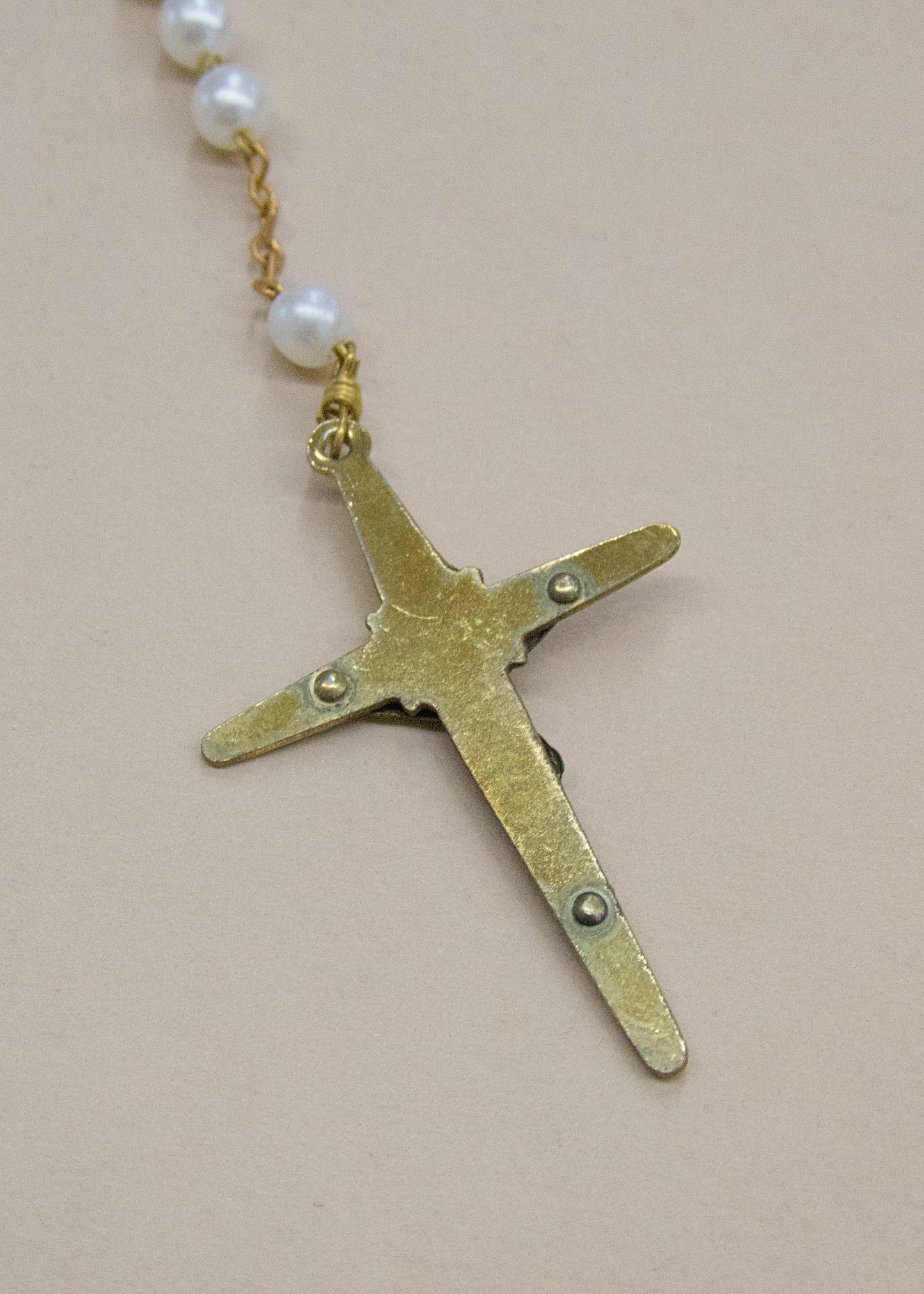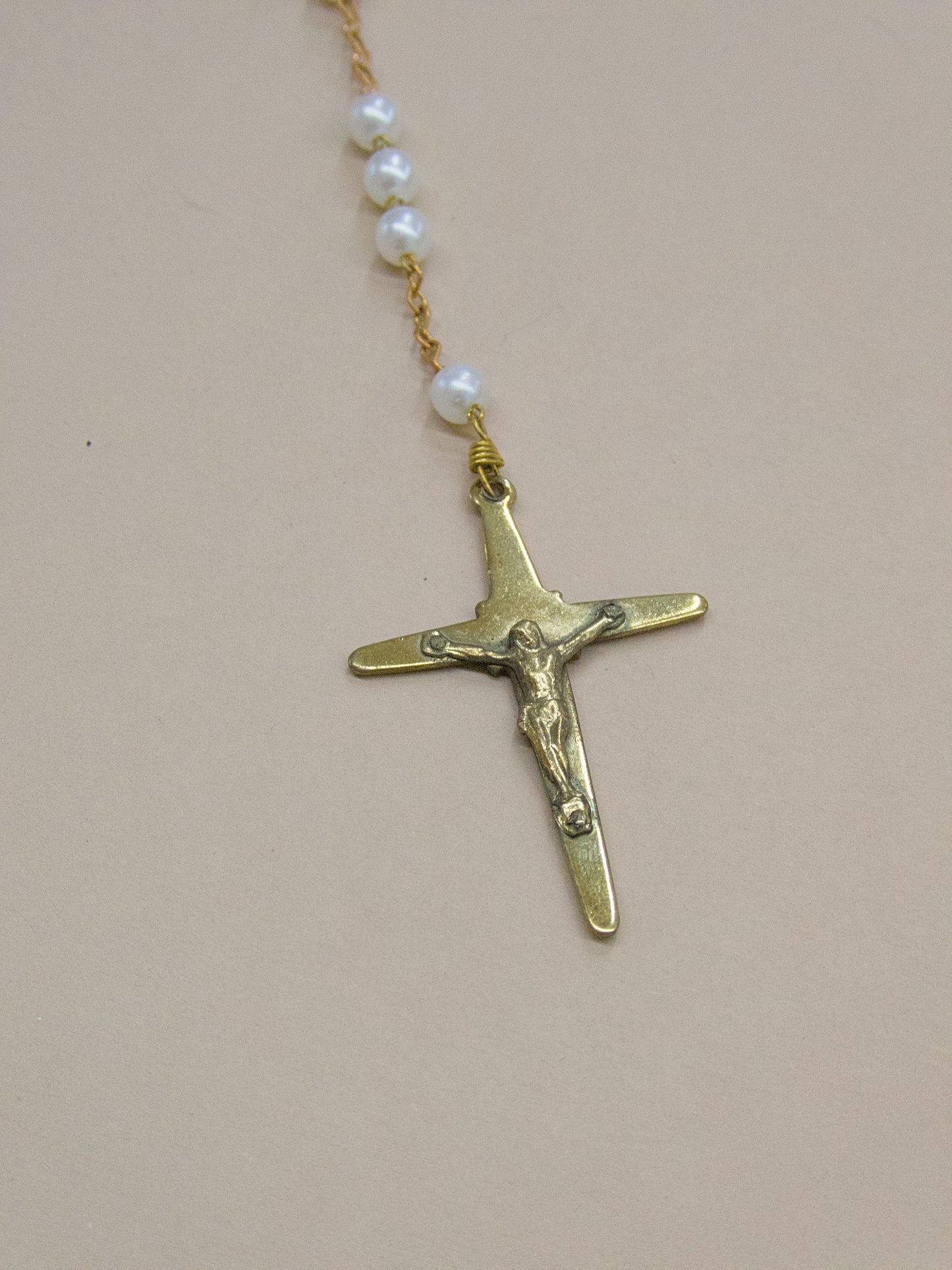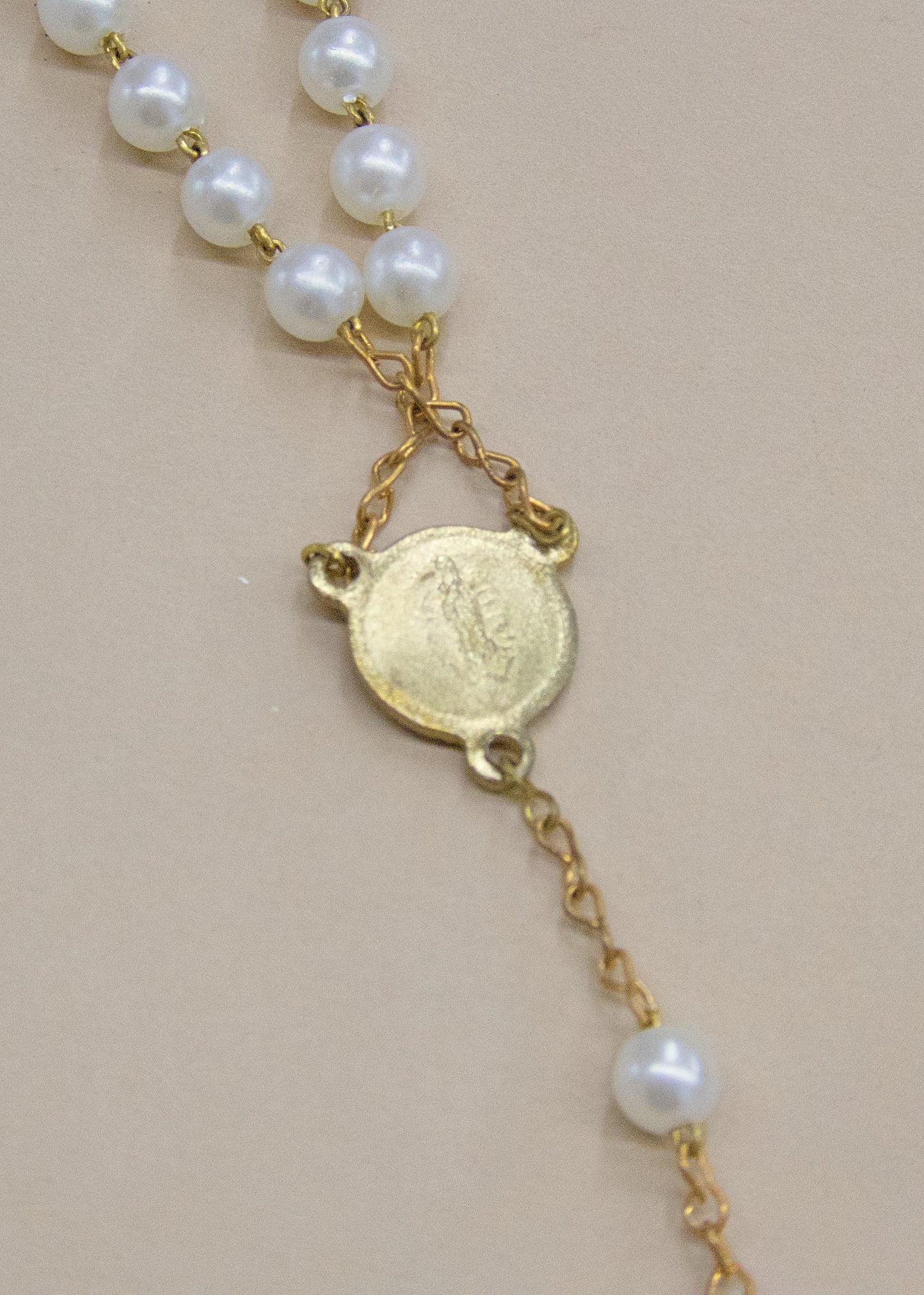 Clutch your pearls, this vintage rosary features faux pearls on a brass colored chain with a drop that has a water from Lourdes detail and a slightly pointed crucifix.
