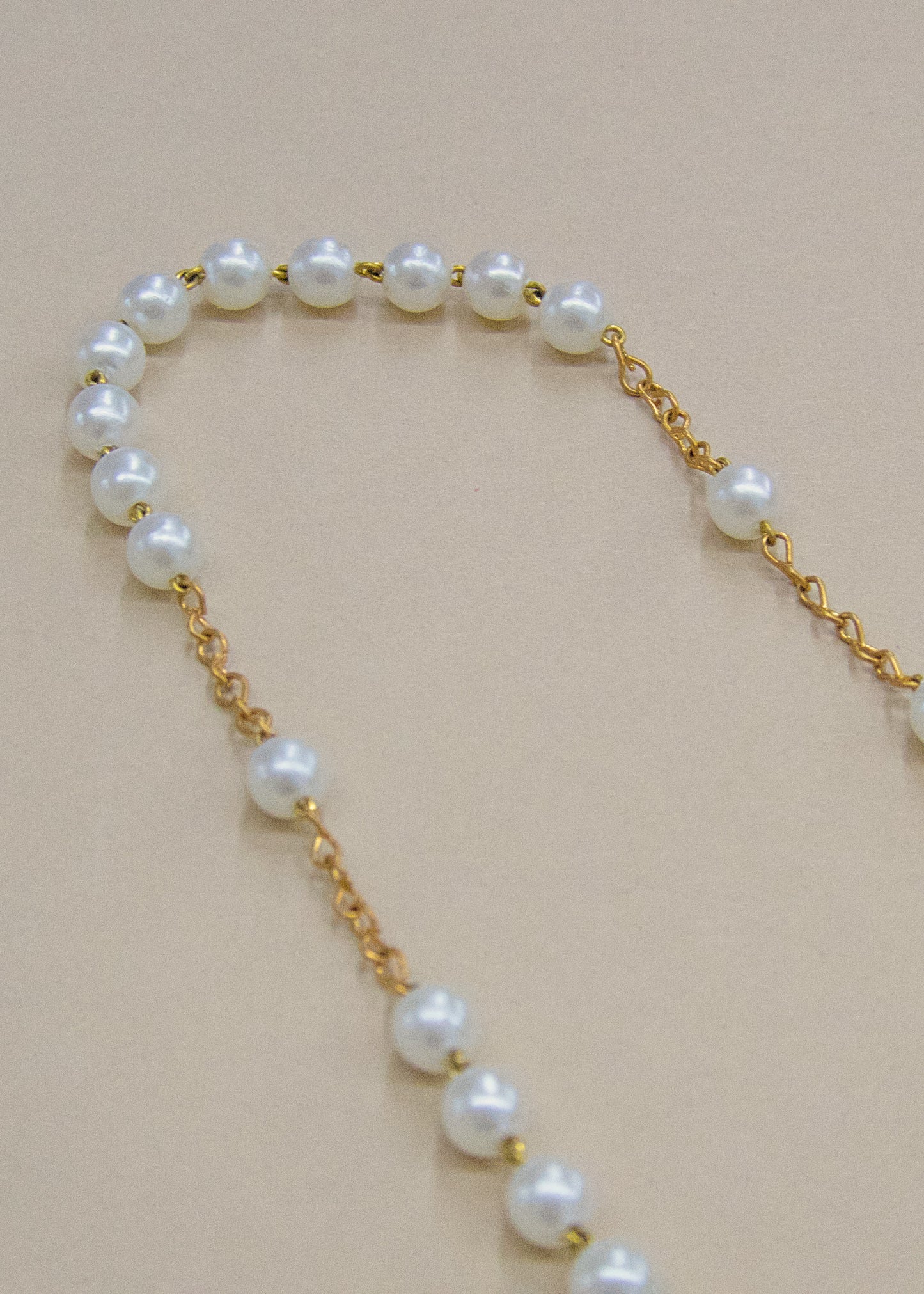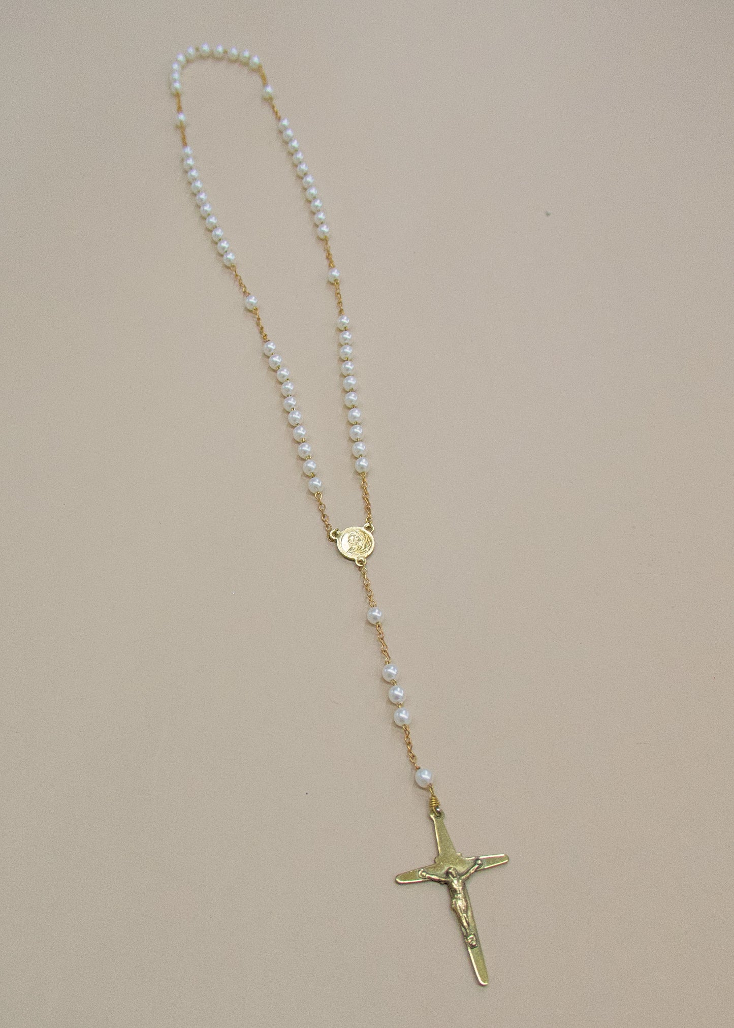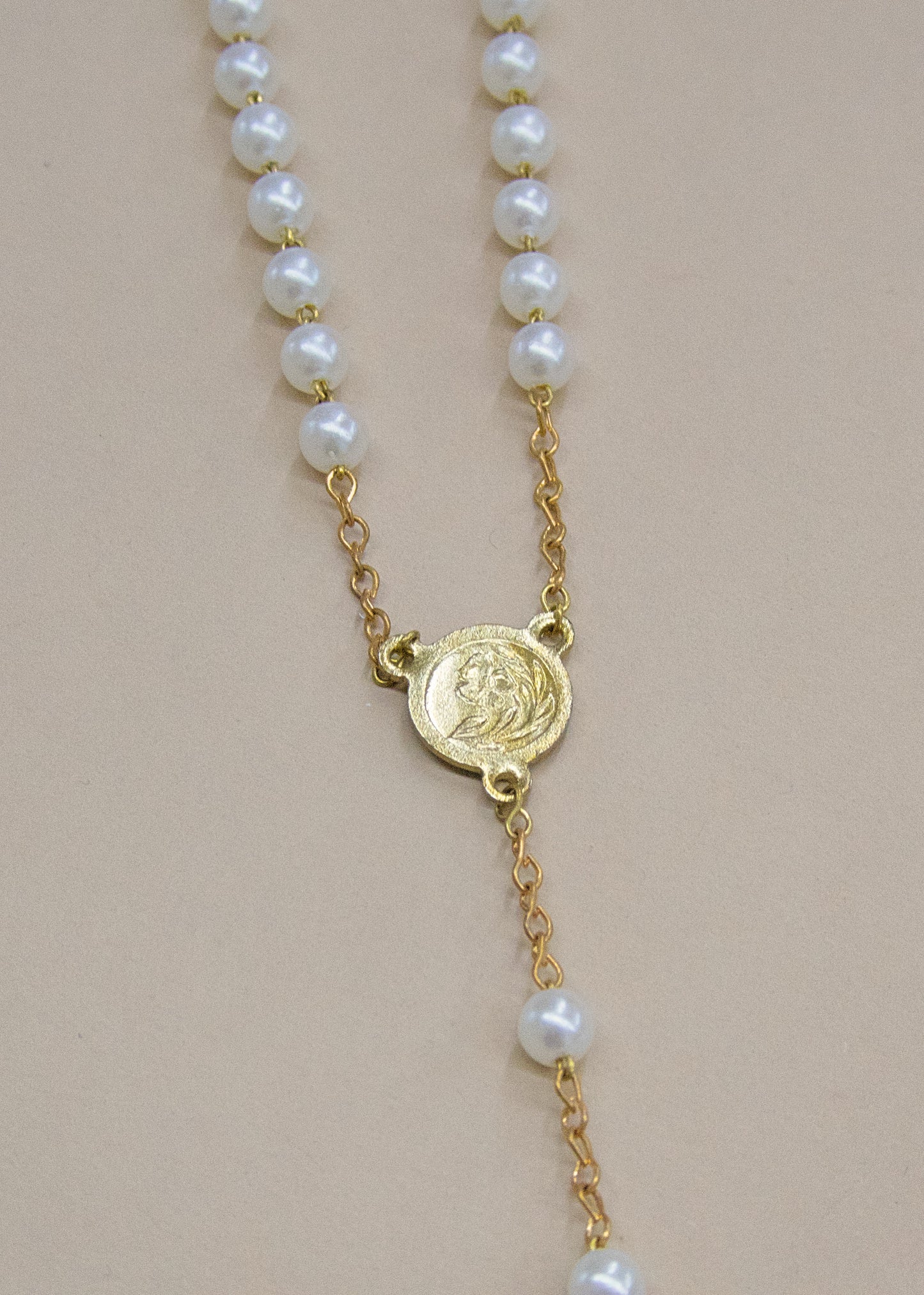 Clutch your pearls, this vintage rosary features faux pearls on a brass colored chain with a drop that has a water from Lourdes detail and a slightly pointed crucifix.