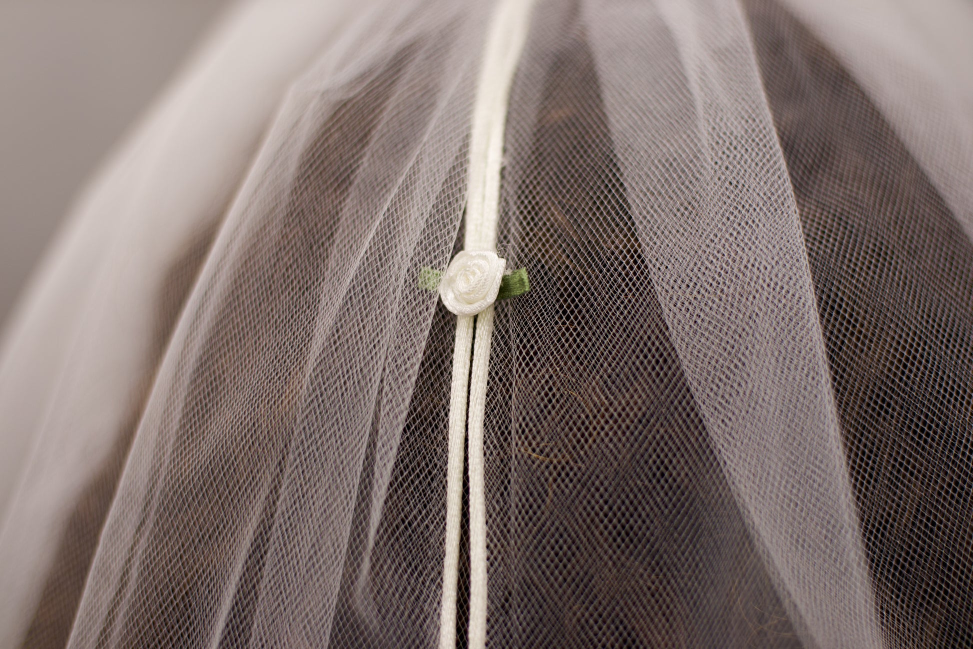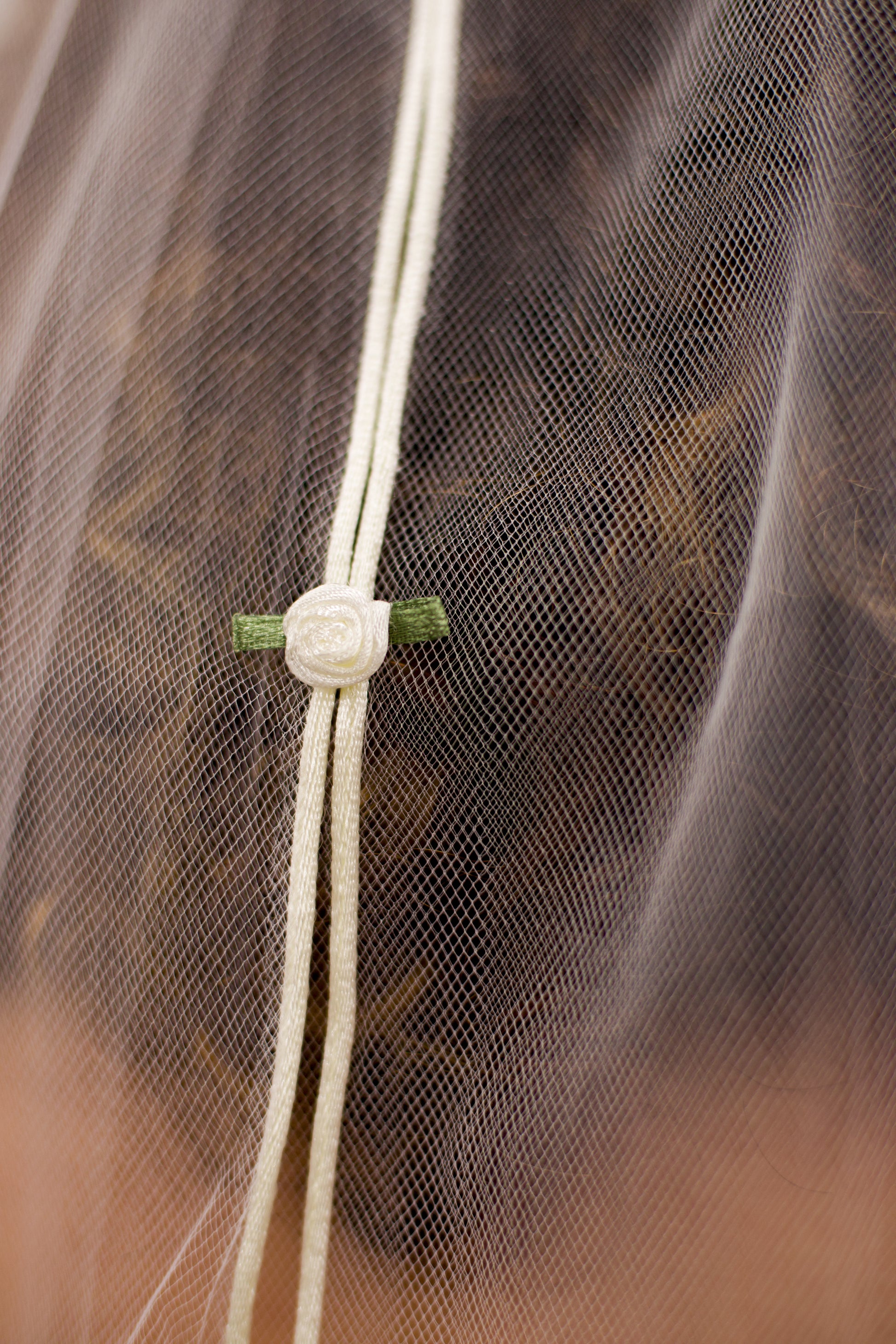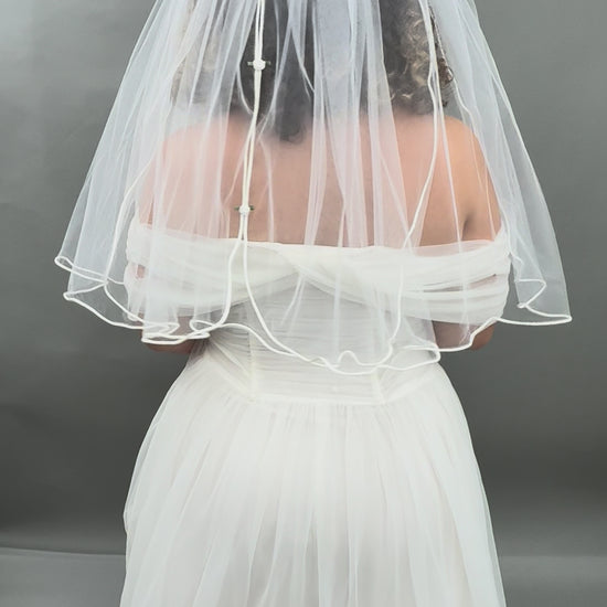 Fall down the rabbit hole into your own bridal wonderland with this whimsical split-tier white veil adorned with three white satin roses with green satin leaves and finished with a rolled white satin trim. Measuring 24 inches long and 48 inches wide, this dreamy split-tier design flutters like a page from a storybook: perfect for the bride who loves romance, curiosity, and a touch of mischief.
