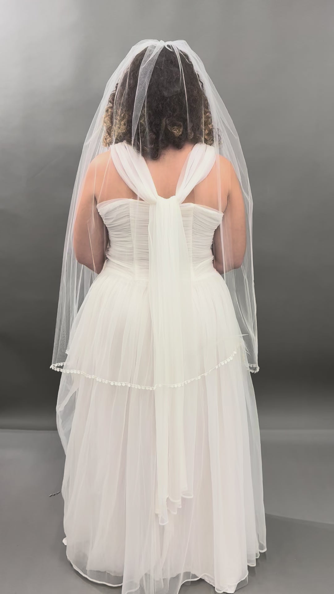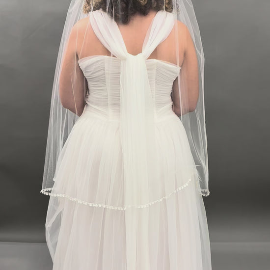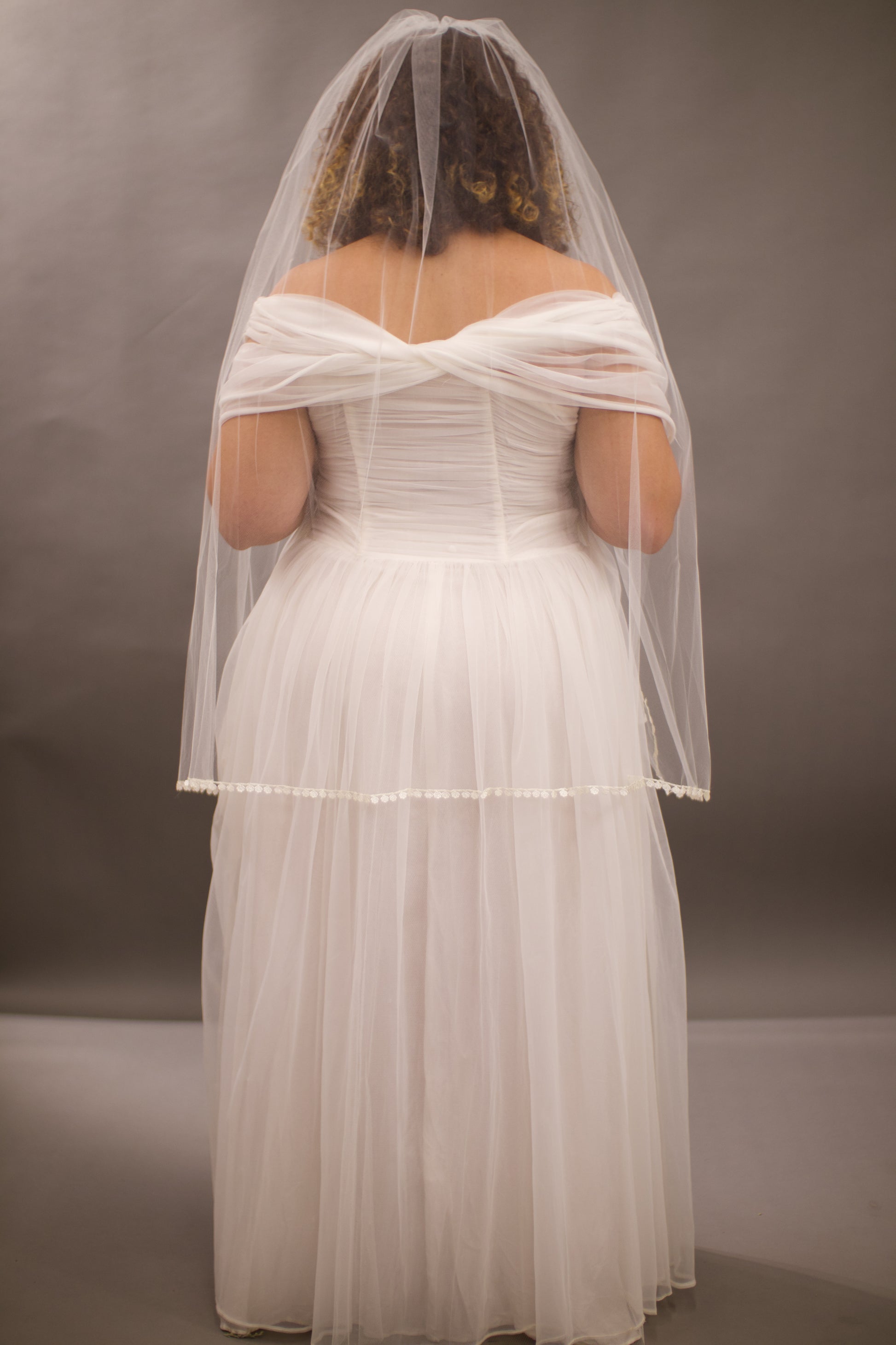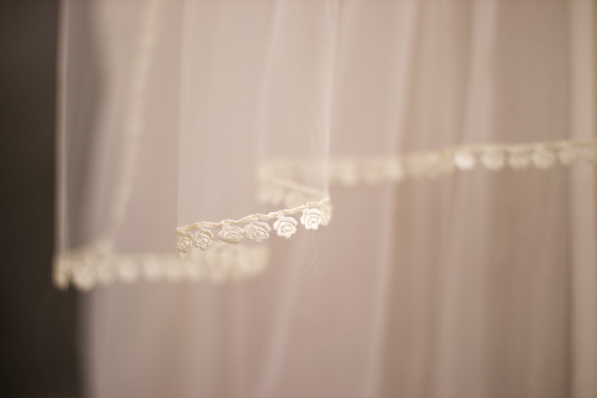 The Rose Veil is a soft romantic ivory veil trimmed with delicate satin rose cut outs. At fingertip length, this one tier veil drapes gently, creating a natural, flowy silhouette that compliments your wedding gown. The satin rose cut out trim catches the light with a subtle sheen resulting in a veil that feels both ethereal and grounded in vintage charm. This veil seamlessly blends 1970's bohemian softness with classic bridal sophistication making it perfect for brides who love vintage textures heirloom quality design.