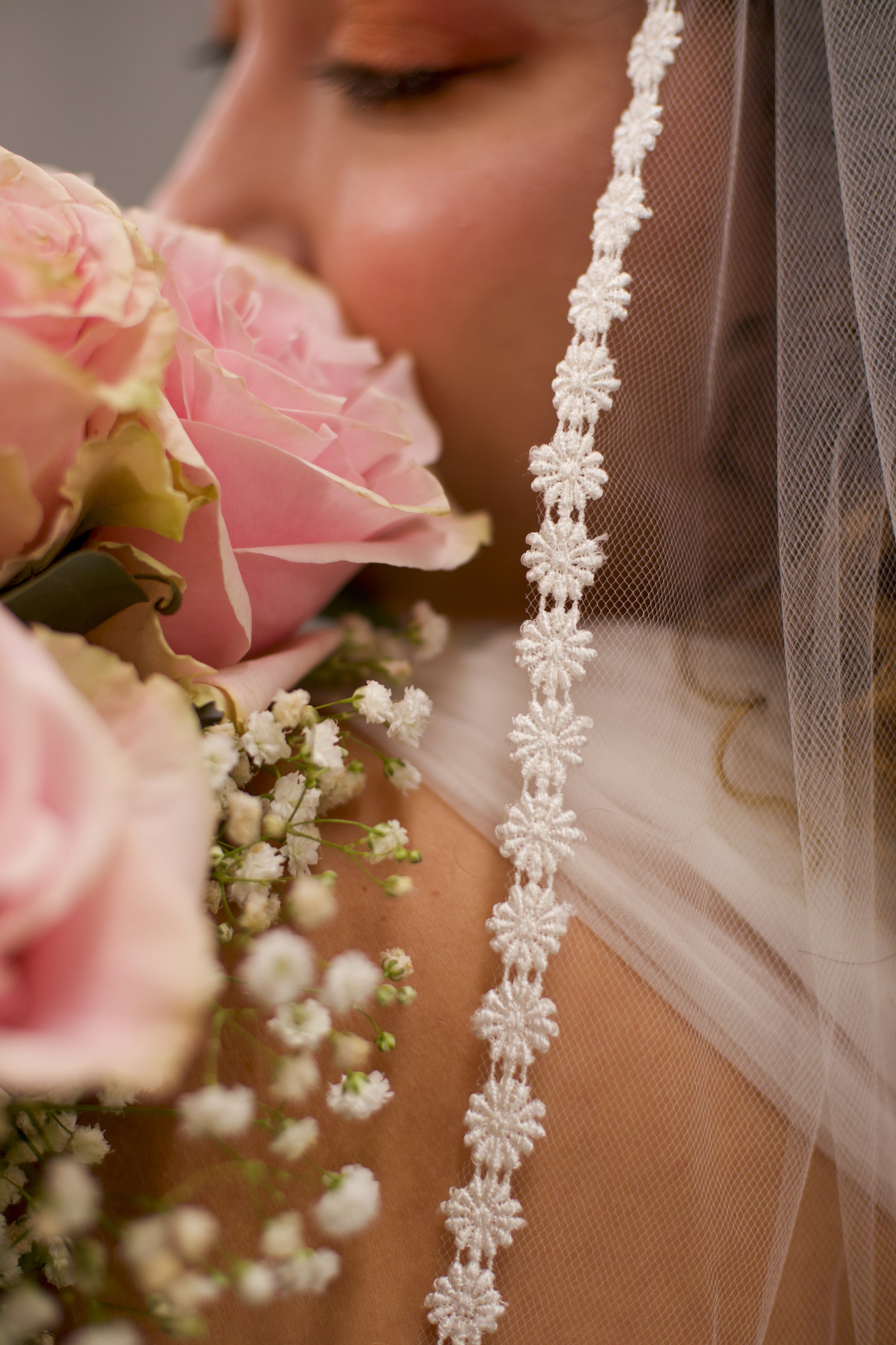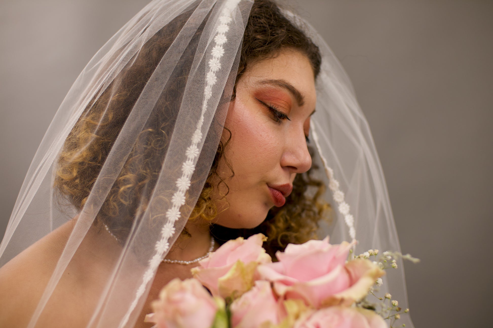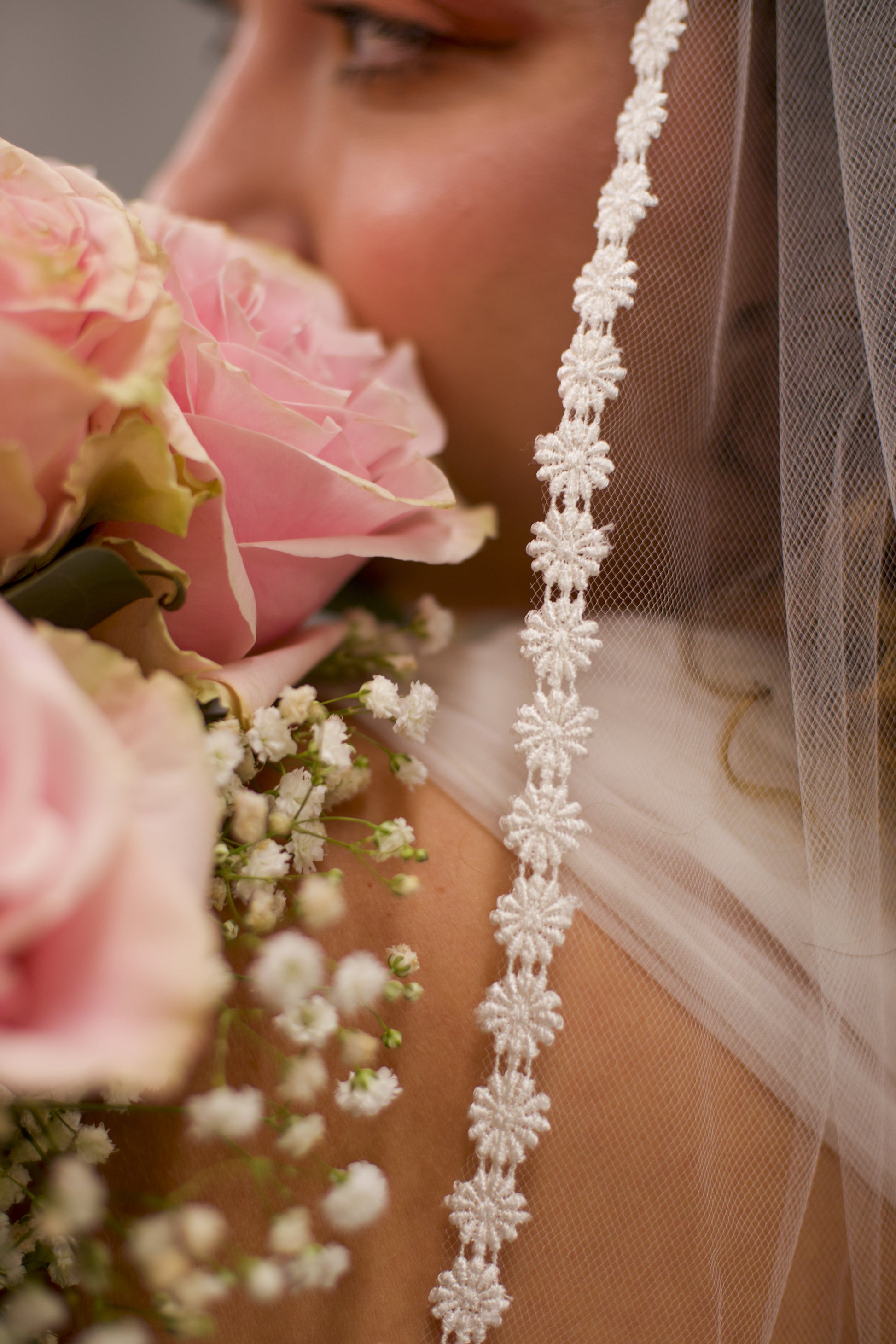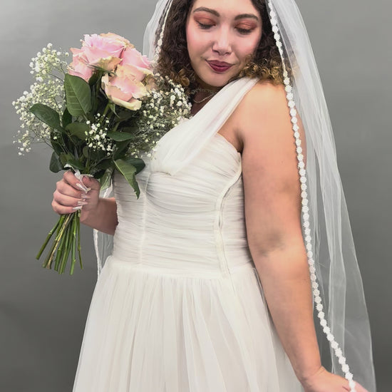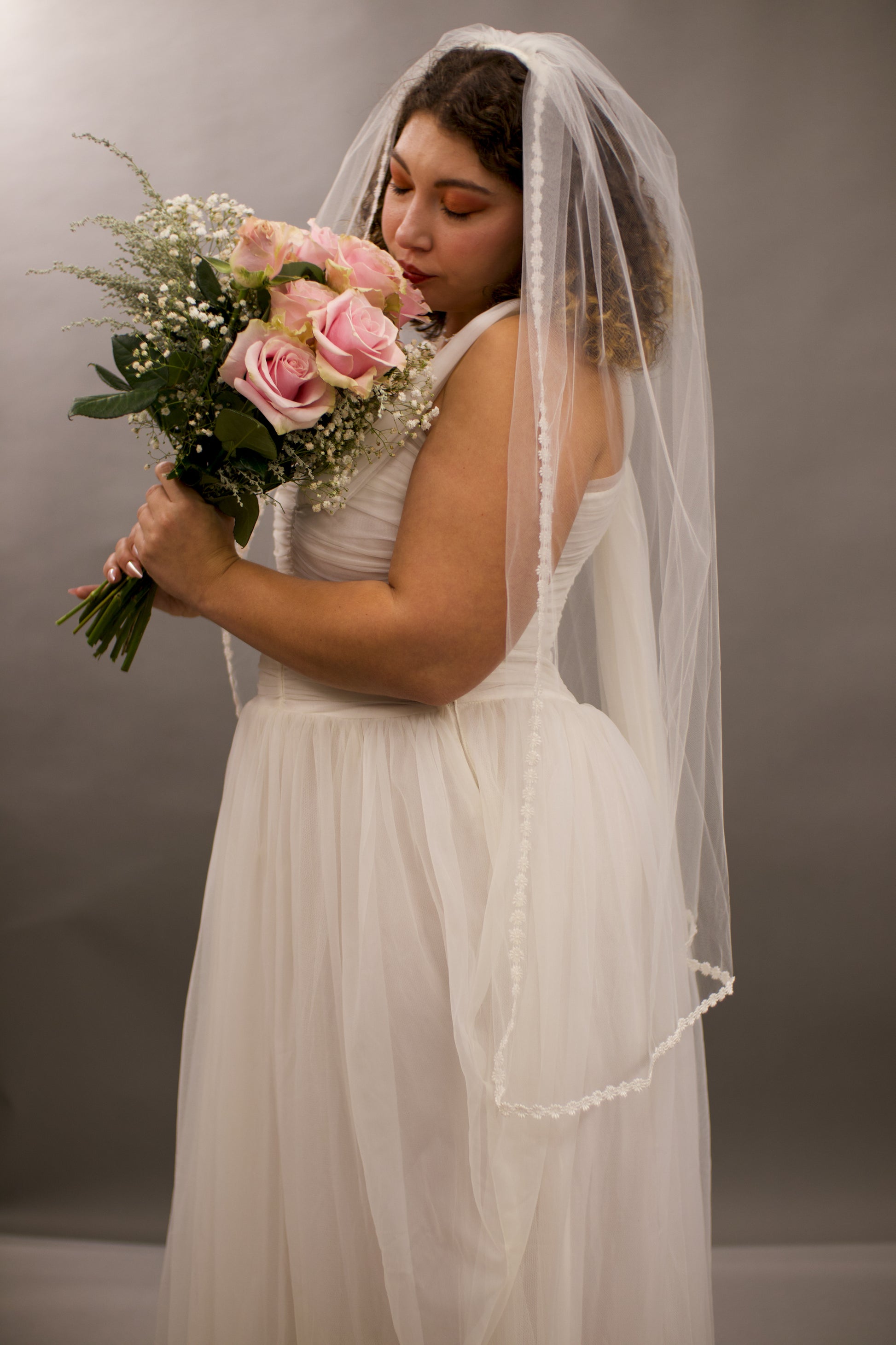 The Sunflower Veil is a love letter to delicate details: airy, floral, and glowing with timeless romance. Crafted in soft ivory tulle and finished with a 12-petal lace flower trim, this 1970's vintage veil captures the grace of a blooming garden. At fingertip length, the Sunflower Veil drapes beautifully, creating a soft, luminous silhouette that enhances your gown.